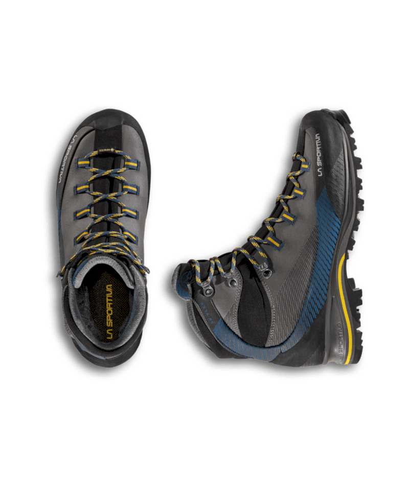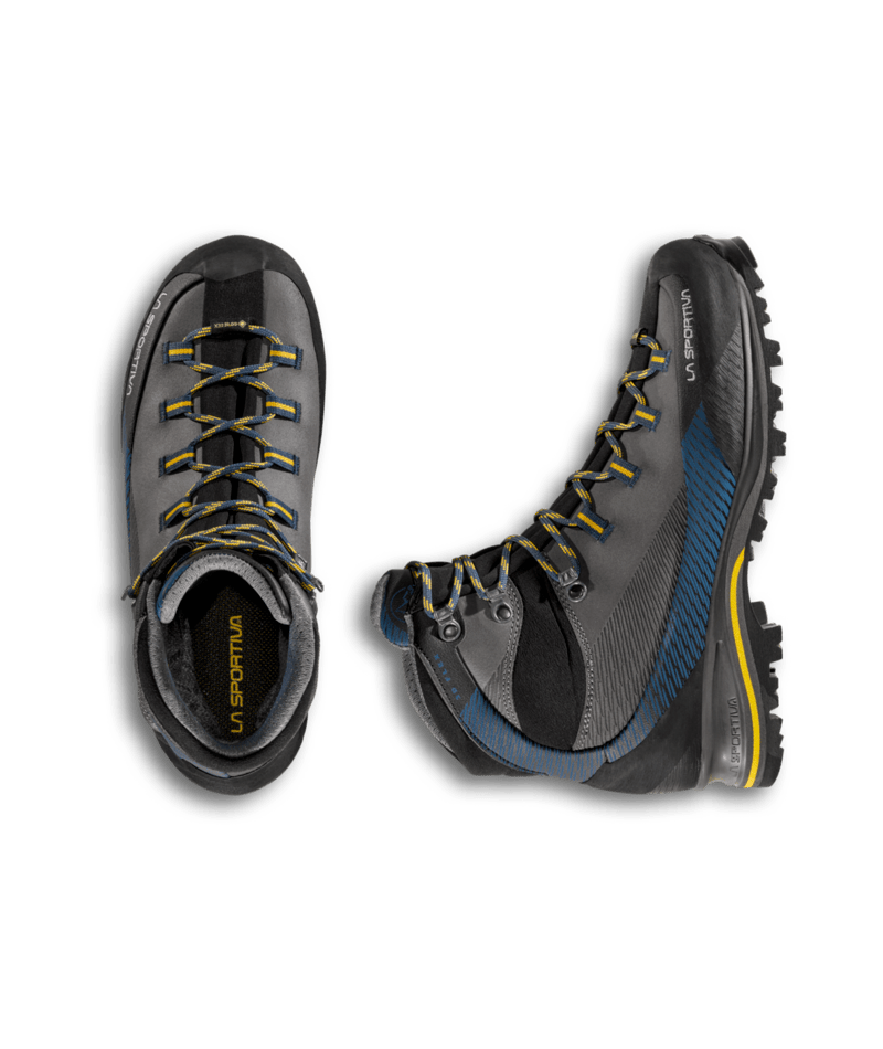 ColorCode: G00E26 | E32O06 | N10R17 Left-over: No PFAS FREE: Yes Plus: + Waterproof, abrasion resistant uppers Product Description B2B: This model distinguishes itself from the other trekking products thanks to the innovative waterproof leather Idro-Perwanger, keeping weight and volume in check. The GORE-TEX Performance Comfort membrane guarantees breathability and waterproofness, the 3D Flex system applied to the heel provides support and allows for the maximum control on steep terrain. The graded lacing system allows for perfect regulation of volumes while the Vibram sole with Climbing zone at the toe makes the shoe idea for via ferratas. The Trango look and La Sportiva technology combine for comfort, protection and safety in the mountains. Promo: No Resole Me: Yes Size Range – Footwear & Equipment: 38 – 48 Sustainability: Yes Vegan Friendly: No Weight – Footwear: 690 g (half pair, size 42)”